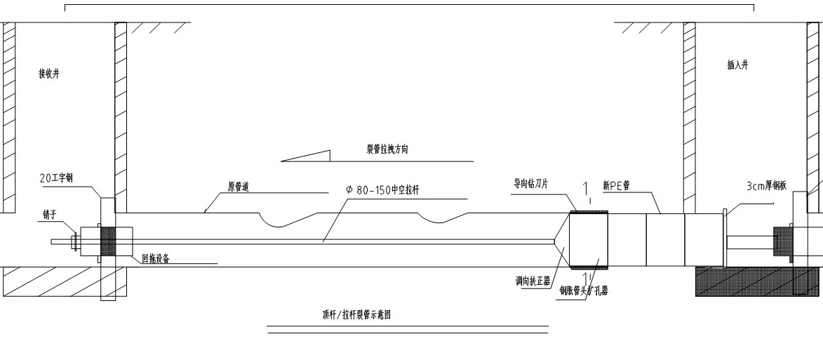 在導(dǎo)向拉桿回拖過(guò)程中,調(diào)向扶正器、導(dǎo)向鉆刀片、鋼脹管頭擴(kuò)孔器處于管道前端,起到劃開(kāi)舊管道,“開(kāi)路”,的作用,在擴(kuò)孔器的尾端連接戶(hù)PE管道,擴(kuò)孔器的直徑要比舊管道的內(nèi)徑略大一些,并且要比新管道的外徑要稍微大些,以便減少新管道進(jìn)入的摩擦力,并且為頂進(jìn)新管道留下一定的余地。同時(shí),在擴(kuò)孔器的尾端緊挨著新管道節(jié)段,新管道節(jié)段緊隨擠擴(kuò)頭回拖。在導(dǎo)向拉桿的拖拉作用下擴(kuò)孔器、新管道依次從插入并進(jìn)入空腔并逐步向前推進(jìn),最終將整條管道更換。