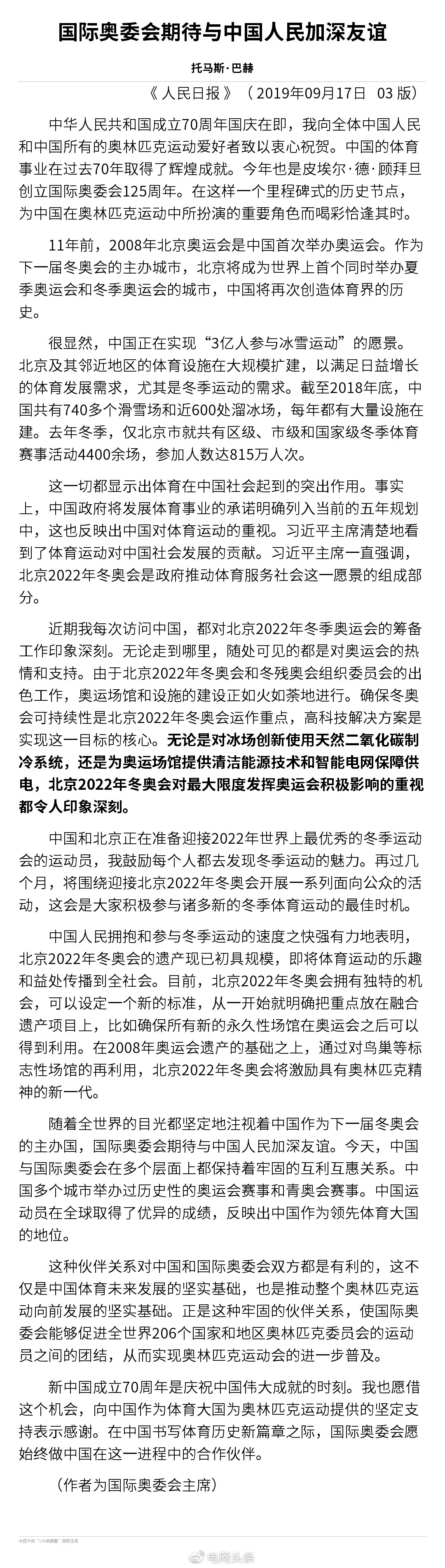 【國際奧委會主席:奧運(yùn)場館清潔能源技術(shù)和智能電網(wǎng)保障,令人印象深刻】國際奧委會主席托馬斯·巴赫在《人民日報》發(fā)表署名文章,其中提到:無論是對冰場創(chuàng)新使用天然二氧化碳制冷系統(tǒng),還是為奧運(yùn)場館提供清潔能源技術(shù)和智能電網(wǎng)保障供電,北京2022年冬奧會對最大限度發(fā)揮奧運(yùn)會積極影響的重視都令人印象深刻。