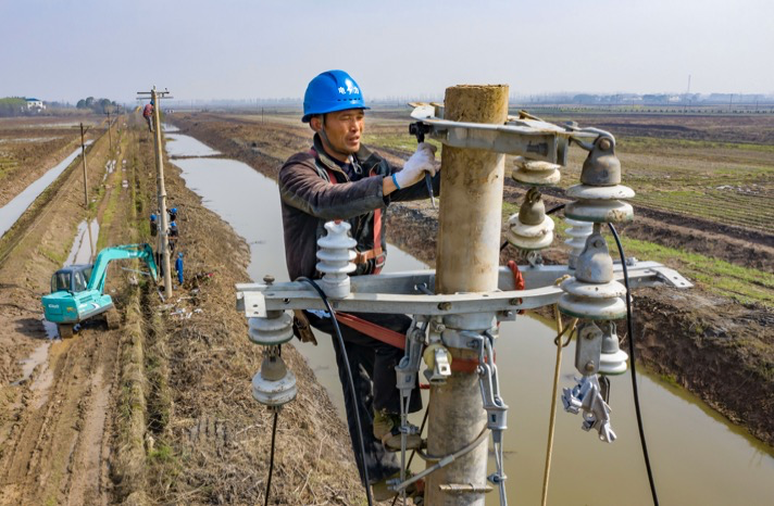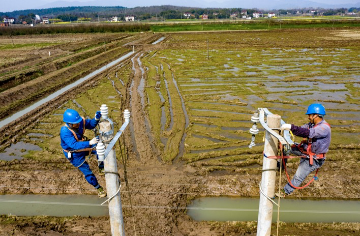 2020年3月25日,在銅陵市普濟(jì)圩現(xiàn)代農(nóng)業(yè)集團(tuán)稻蝦養(yǎng)殖基地,農(nóng)戶正在為稻蝦田潑灑肥水,在這一片五萬畝農(nóng)田里,春耕備耕正在抓緊進(jìn)行。在這片生機(jī)盎然的綠色農(nóng)業(yè)背后,一排沿著田間溝壑的電桿正在架設(shè),它們將為這片希望的田野提供堅(jiān)強(qiáng)可靠的電力灌溉,助力綠色農(nóng)業(yè)產(chǎn)業(yè)升級(jí)。