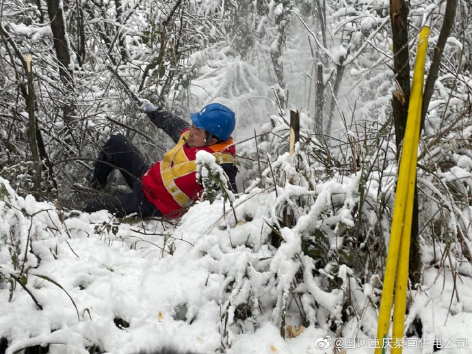 【迎峰度冬】1月17日,國(guó)網(wǎng)重慶綦南供電公司南桐供電所工作人員對(duì)10千伏林行線天生橋臺(tái)區(qū)開展雪后特巡。