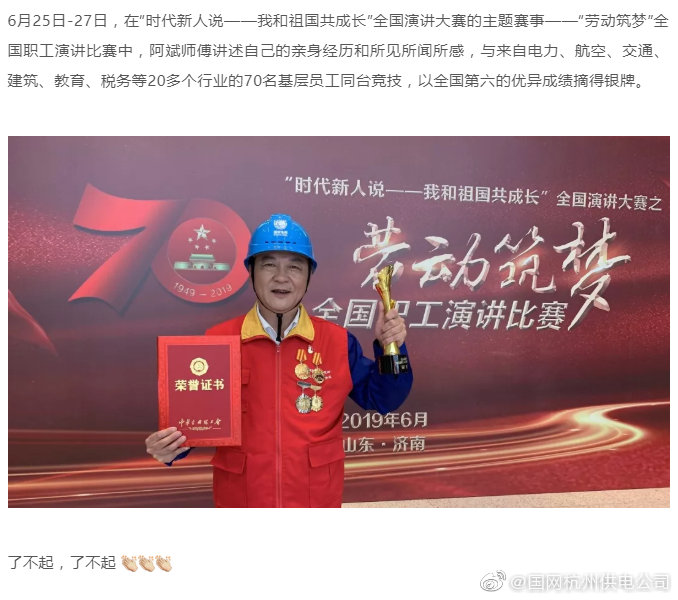 【這三個黨建“牛人”,今天要給個頭條】6月25日-27日,在“時代新人說——我和祖國共成長”全國演講大賽的主題賽事——“勞動筑夢”全國職工演講比賽中,阿斌師傅講述自己的親身經(jīng)歷和所見所聞所感,與來自電力、航空、交通、建筑、教育、稅務(wù)等20多個行業(yè)的70名基層員工同臺競技,以全國第六的優(yōu)異成績摘得銀牌。