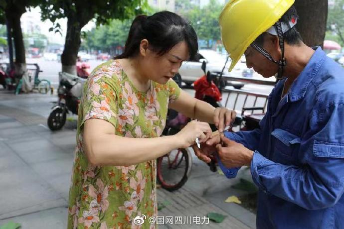 7月26日,國網(wǎng)資陽供電公司雁江供電公司小哥哥修理10kV中晶二線上“張牙舞爪”的樹枝,變身汗?jié)褚卤车摹胺ツ竟ぁ?。伐木完畢,危機(jī)消除,店鋪老板看到小哥哥弄傷手指,細(xì)心為他貼上創(chuàng)可貼。