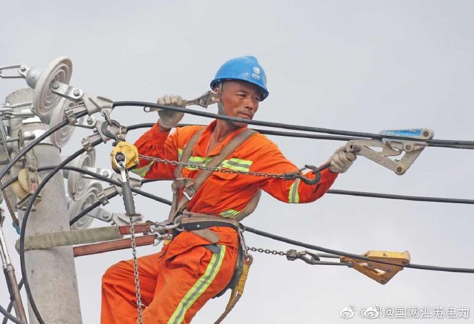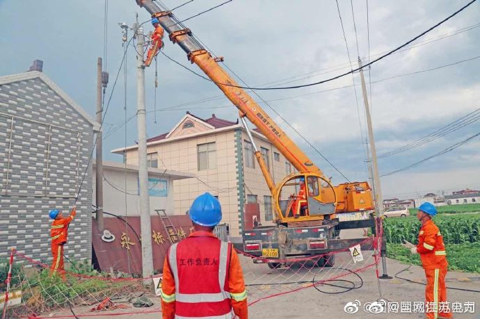 【戰(zhàn)高溫改電網(wǎng) 保障小微企業(yè)用電】7月27日,國網(wǎng)東臺市供電公司電力施工人員戰(zhàn)高溫,為溱東鎮(zhèn)開莊村小微企業(yè)改造供電線路,滿足發(fā)展用電需求,保障盛夏可靠用電。 ????