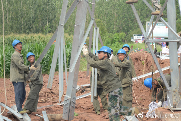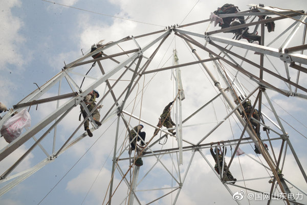 【加快重點線路建設(shè) 助力經(jīng)濟發(fā)展】8月6日,國網(wǎng)莒縣供電公司工作人員在莒縣碁山鎮(zhèn)水由村組裝35千伏招賢至安莊輸電線路鐵塔,在烈日的炙烤下,鐵塔變得滾燙,工作人員克服酷暑堅持在高空中完成施工作業(yè),為線路早日投運奠定基礎(chǔ)。 ????