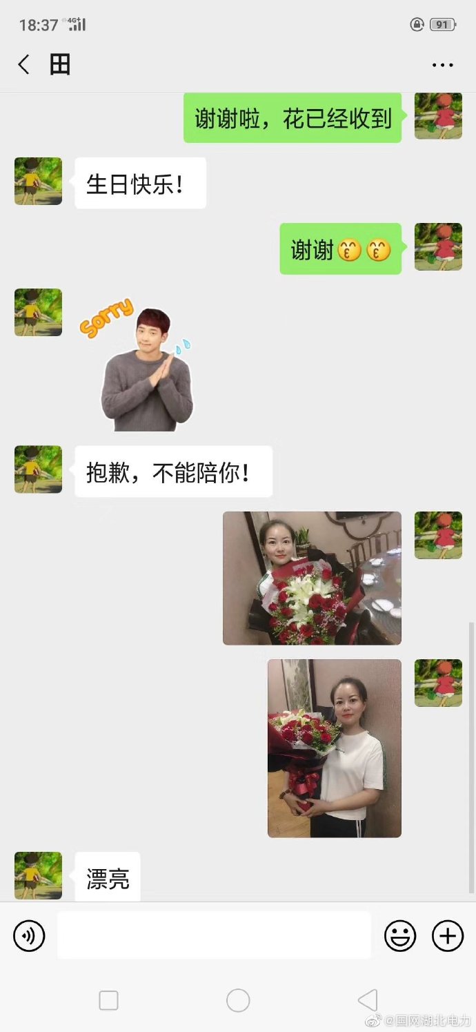 【當(dāng)妻子生日遭遇搶修】8月6日,國網(wǎng)丹江口市供電公司均州供電所員工胡菁收到一束嬌艷欲滴的玫瑰花,原來當(dāng)天是她的生日!當(dāng)她欣喜地感嘆老公“懂板”時,卻收到遠(yuǎn)在牛河供電站丈夫田金安的道歉微信。當(dāng)日,暴雨襲擊了整個丹江口市,在牛河供電站值班的丈夫正忙著搶修,無法趕回來給妻子過生日,只能簡單地在微信上告訴妻子。同為電力職工的胡菁不生氣,她明白,每一家的燈火通明,都有著電網(wǎng)職工的守護(hù)。