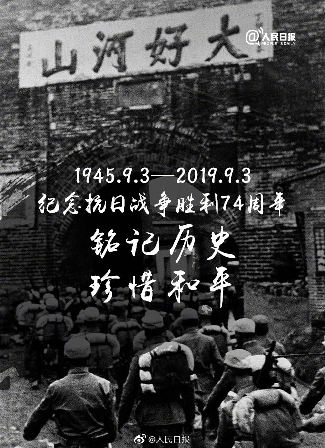 【今天發(fā)條微博,為了不能忘卻的紀(jì)念】9月3日,是每個中國人都該銘記的日子。14年浴血奮戰(zhàn),3500多萬同胞傷亡,74年前的這一天,終于迎來中華民族的勝利。如今,硝煙散去,可那段血淚寫就的過去不能忘,那場不屈不撓的抗?fàn)幉桓彝?。今天,中國人民抗日?zhàn)爭勝利紀(jì)念日,勿忘歷史,吾輩自強!