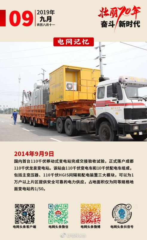 2014年9月9日,國內(nèi)首臺110千伏移動式變電站完成交接驗(yàn)收試驗(yàn),正式落戶成都110千伏龍泉變電站。該站由110千伏變電車和10千伏配電車組成,包括主變壓器、110千伏HGIS間隔和配電裝置三大模塊,可以為1萬戶以上片區(qū)提供安全可靠的電力供應(yīng),占地面積僅為同等規(guī)格地面變電站的1/50。