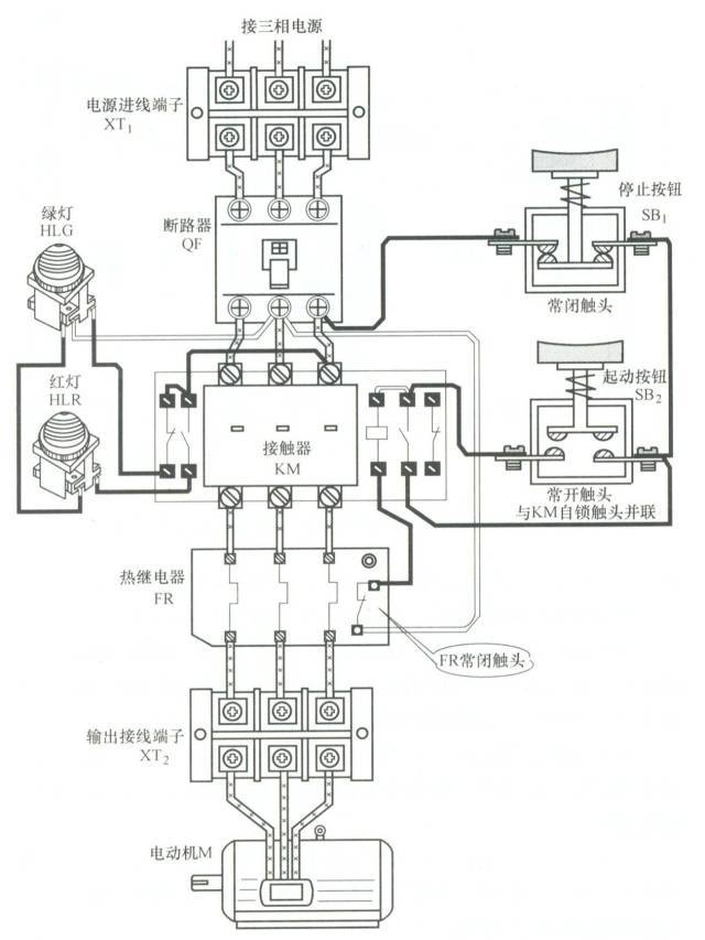主電路路徑為:電源L1、L2、L3→端子板XT1→斷路器QF→接觸器KM主觸頭→熱繼電器FR→端子板XT2→電動機(jī)。