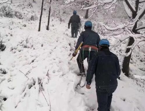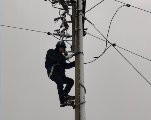 雪花嗖嗖地向搶修人員臉上拍打,弄得臉生疼。在現(xiàn)場(chǎng)負(fù)責(zé)人叮囑下,搶修作業(yè)人員盡管裸露在外的面頰已經(jīng)被冰雪凍得通紅,但是仍然全神貫注地進(jìn)行著手中的工作。手凍得快裂開(kāi),臉上卻冒著汗,地面上監(jiān)護(hù)人員站在泥濘的土地里時(shí)刻提醒搶修人員注意安全。