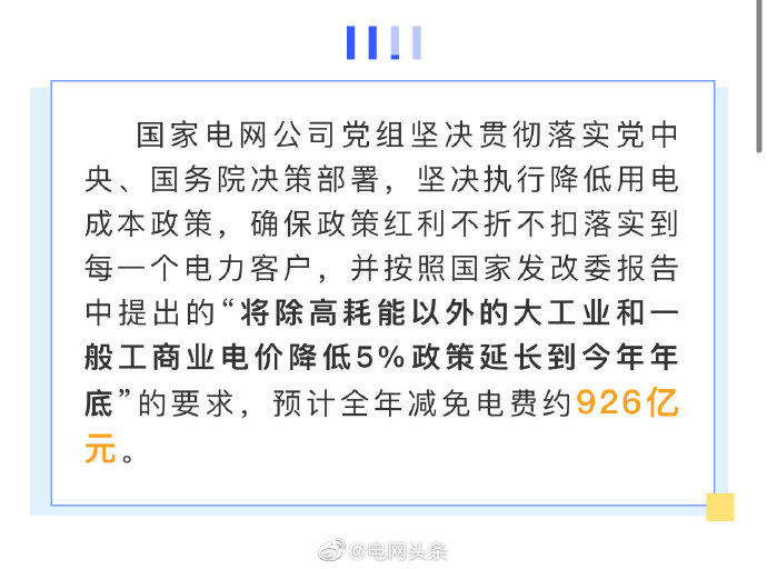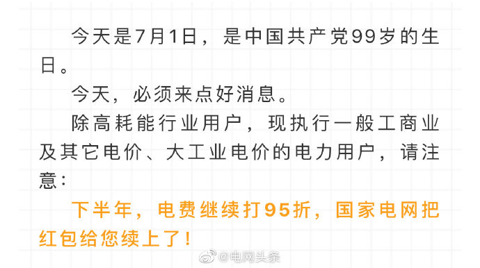 除高耗能行業(yè)用戶,現(xiàn)執(zhí)行一般工商業(yè)及其它電價(jià)、大工業(yè)電價(jià)的電力用戶,請(qǐng)注意:下半年,電費(fèi)繼續(xù)打95折,國(guó)家電網(wǎng)把紅包給您續(xù)上了!